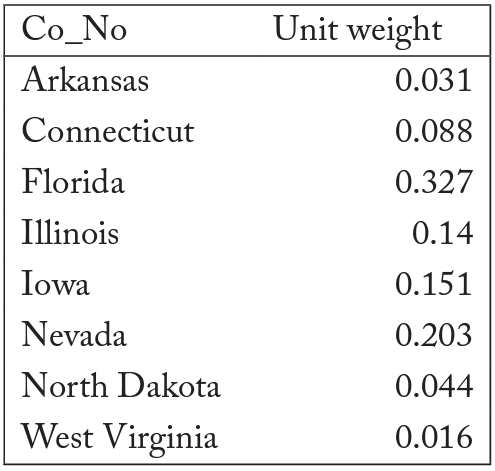 After performing the estimation, the synthetic version of New Jersey comprised eight states drawn from a pool of forty-two states. They were Arkansas, Connecticut, Florida, Illinois, Iowa, Nevada, North Dakota, and West Virginia. The population average of the eight states that constituted the synthetic New Jersey can be found in table 3. The death-rate trends in New Jersey are best replicated by the eight states in our synthetic New Jersey; all other states received a weighting of 0 from the estimation.