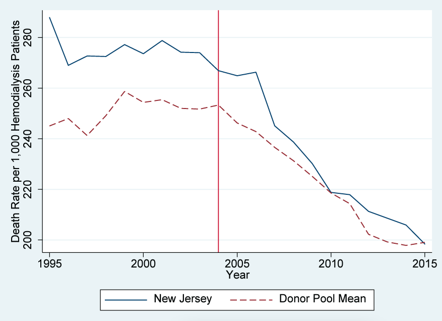 This paper contributes to the literature on both the provision and quality of hemodialysis. Past hemodialysis research primarily focused on the setting in which treatments are delivered or the staff-to-patient ratios within the clinics. We tested the effect on quality measures of New Jersey’s rule prohibiting an administrator from engaging in clinical activities and thereby requiring that hemodialysis clinics hire a nurse to function solely in an administrative capacity. Since the implementation of the rule, the death rate of hemodialysis patients has fallen, but so has the trend in the United States overall. Therefore, we employed the SCM to create a control state to compare with New Jersey.
