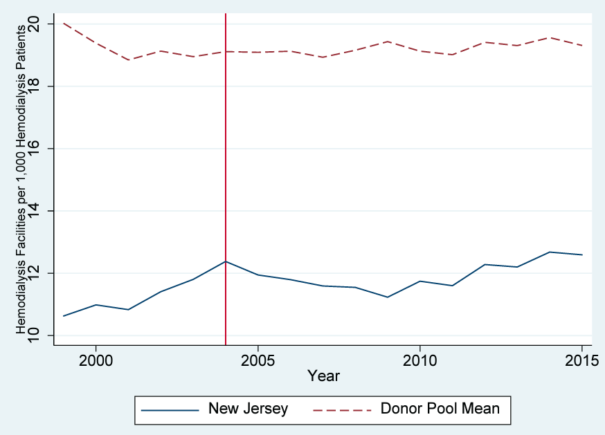 In this study, we estimate the impact of the New Jersey regulation. Hiring additional staff may help to ensure patients receive more care from clinic staff, but requiring that the charge nurse never serve in an administrative capacity may increase the cost of operating the clinic without providing benefit for the patients receiving treatment. In order to test which of these effects is stronger, we use the synthetic control method (SCM) to compare patient outcomes in New Jersey to a weighted average group of control states that produce a “synthetic New Jersey” meant to mimic New Jersey but without the nurse-staffing rule. We find no evidence that the mandate improved the quality of care offered by hemodialysis clinics.