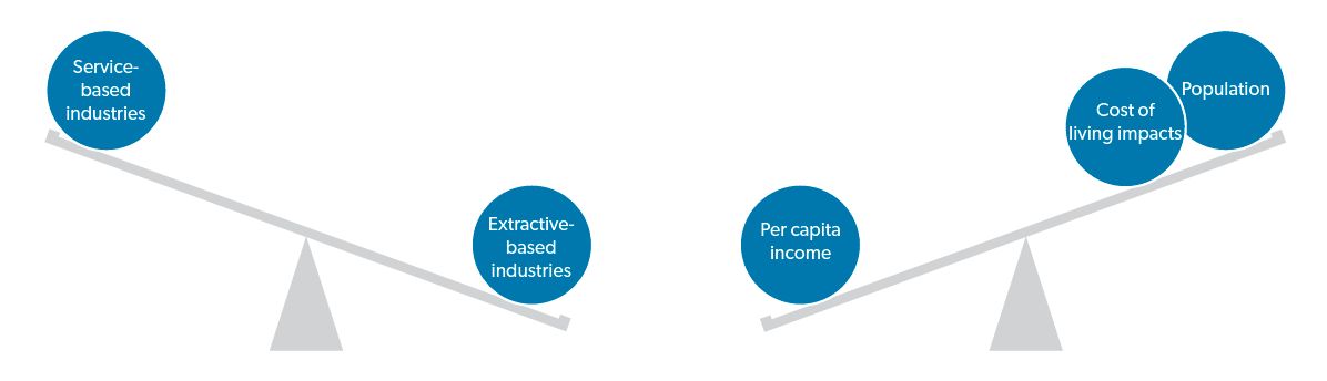 Another complicating factor is that gains in one metric are often offset by losses in another. One study comparing income and housing costs from 1990–2001 between counties with and without high levels of natural amenities concluded that although counties with natural amenities had family incomes that were $9,000 higher on average, this did not equate to greater economic prosperity. Because median housing costs in amenity-rich counties were double the median housing costs in amenity-poor counties, gains in income were offset by rising housing costs.28Lori M. Hunter, Jason D. Boardman, and Jarron M. Saint Onge, “The Association between Natural Amenities, Rural Population Growth, and Long-Term Residents’ Economic Well-Being,” Rural Sociology 70, no. 4 (December 2005): 452–69, https://doi.org/10.1526/003601105775012714. This raises an important question—which indicators of economic health are most important?