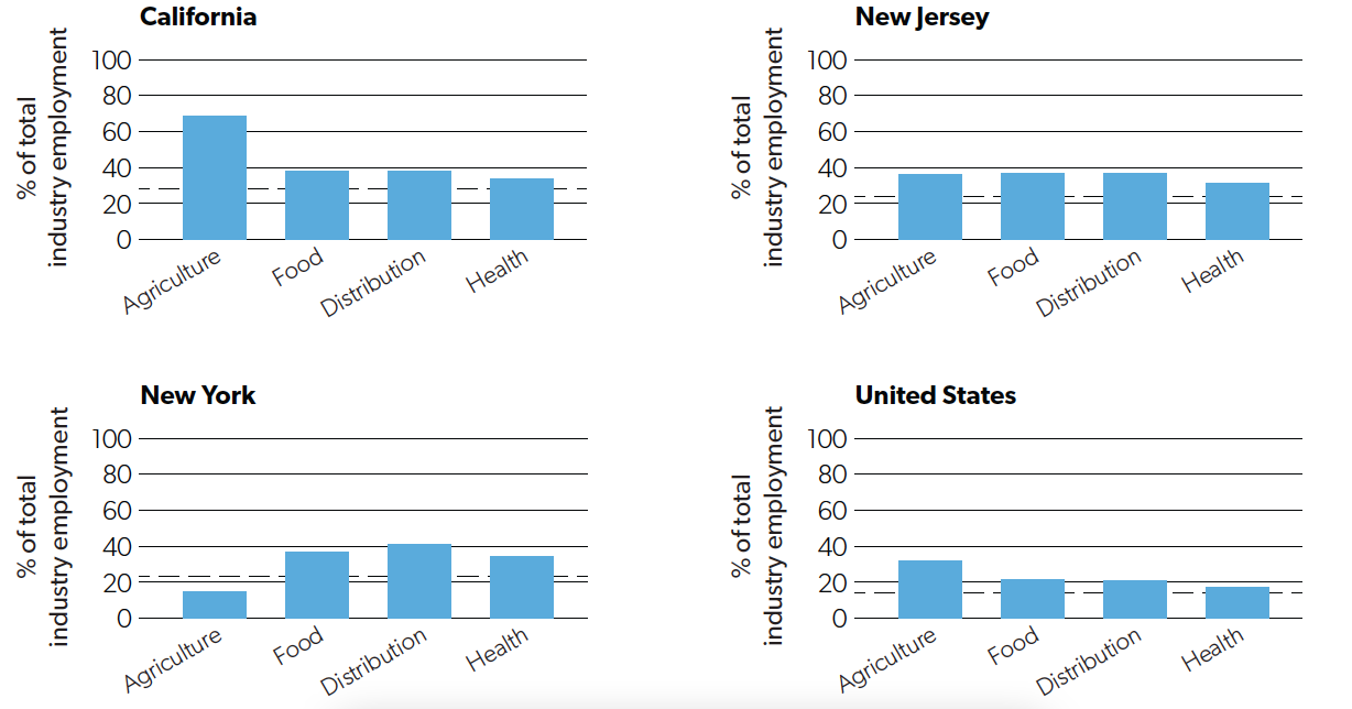 Turning to agriculture, the US national production of agricultural goods depends heavily on foreign-born workers, which represent one-third of national workers, and close to 70% of California’s agricultural workers. Overall, it is indisputable that immigrants are a large and over-represented proportion of the group of essential workers in the US. They keep stores stocked with food first from farms, then to grocery stores, and ultimately to our kitchen tables.