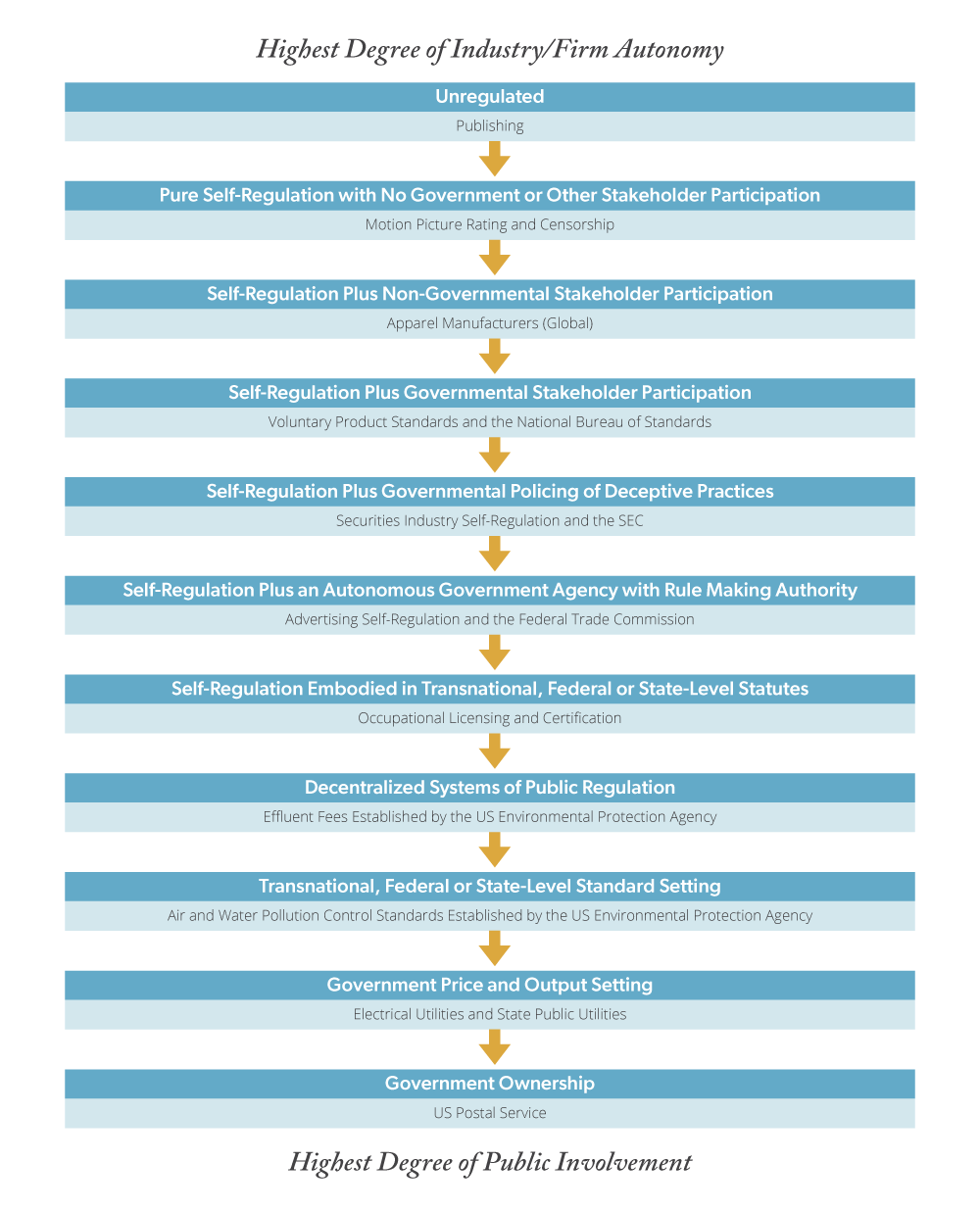 The term “self-regulation” in the context of private governance is a critical concept in the Industry Regulatory Spectrum. As Hemphill explains, “self-regulation exists when a firm, an industry, or the business community establishes its own standards of behavior (1) where no such statutory or regulatory requirements exist or (2) when such standards assist in complying with or exceeding statutory or regulatory requirements.”27Thomas A. Hemphill, “Self-Regulating Industry Behavior: Antitrust Limitations and Trade Association Codes of Conduct,” Journal of Business Ethics 11, no. 12 (1992): 915, https://doi.org/10.1007/BF00871957.