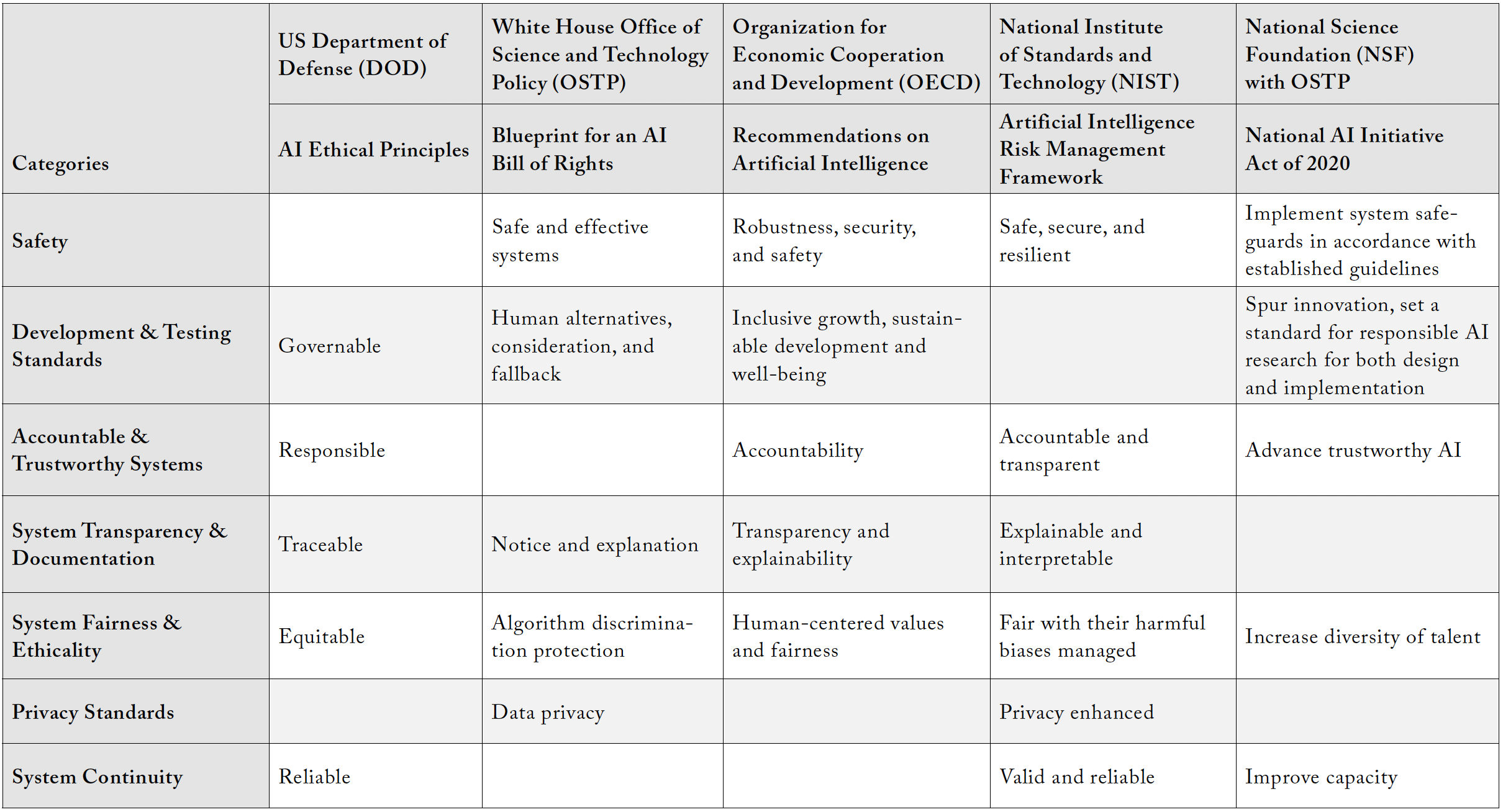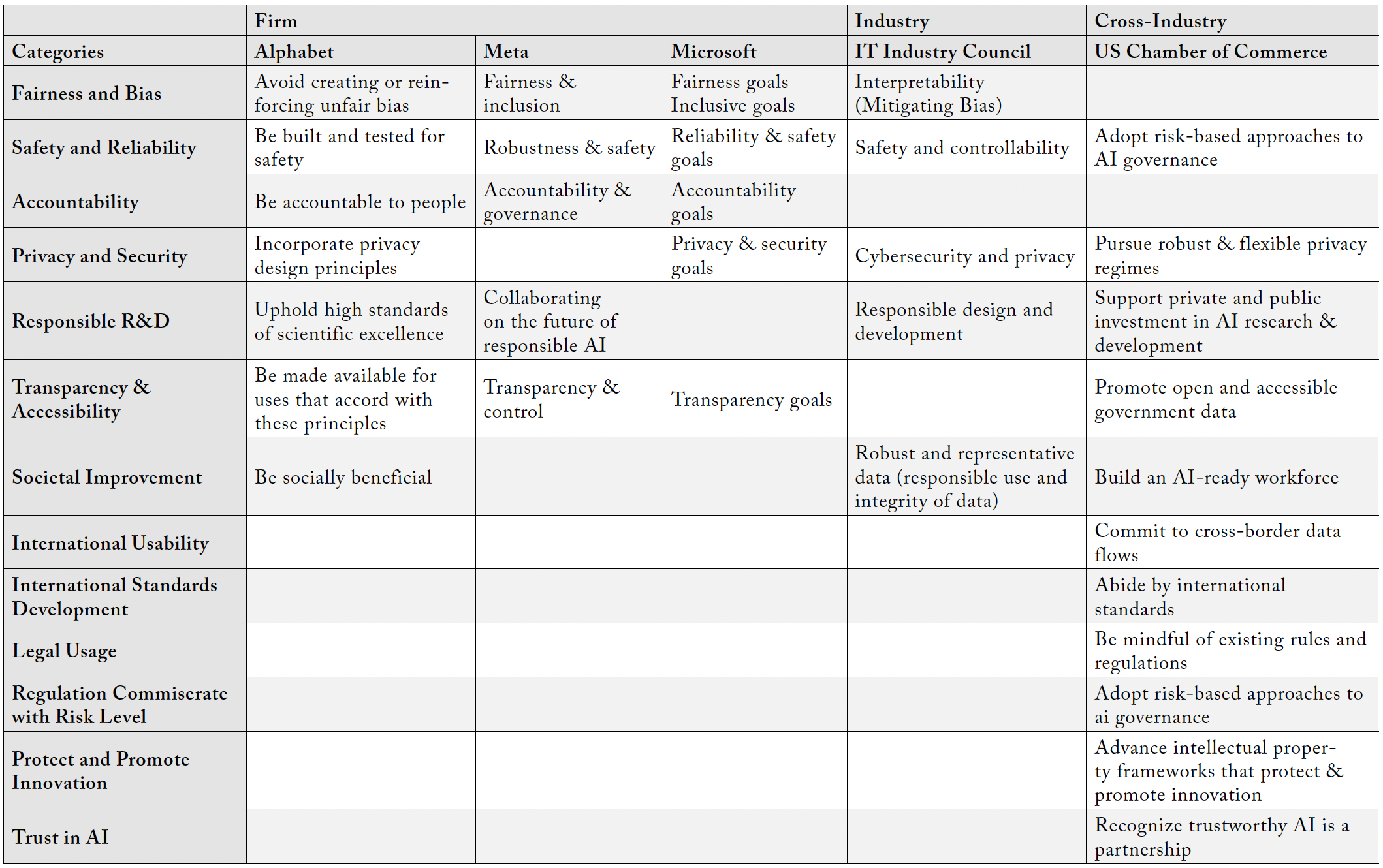 In table 2, Artificial Intelligence Policy Principles, again using an affinity diagram, an inventory of these five major firm-, industry-, and cross-industry examples of organizational AI policy principles with each AI policy principle categorized by thematic similarity across organizations (This is not a scientific sample, but for illustrative policy purposes, only).73The information utilized in table 2 “Artificial Intelligence Policy Principles: Firm, Industry, and Cross-Industry’” is drawn from organizational documents found at the following references: Information Technology Industry Council, “AI Policy Principles;” U.S. Chamber of Commerce, “Principles on Artificial Intelligence;” Google, 2022 Principles Progress Update; Meta, “Facebook’s Five Pillars of Responsible AI;” Microsoft, Microsoft Responsible AI Standard, v2.