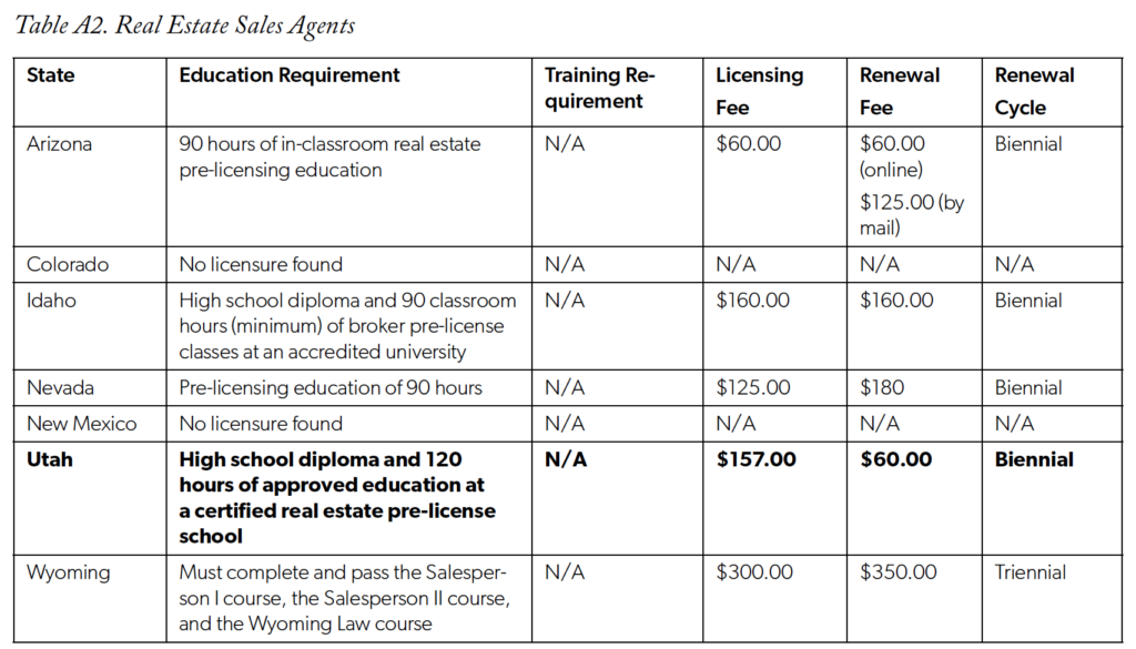 Our next comparison focuses on real estate sales agents and is illustrated in figure 2. A real estate sales agent is an employee under a principal broker and aids in the process of buying and selling real estate. Sales agents do not require as much experience to begin working as associate real estate brokers discussed above. Colorado and New Mexico do not license real estate agents. Among the five states in the region that do license real estate sales agents, Utah has the most stringent requirements. Utah requires aspiring real estate sales agents to complete high school and 120 hours of additional education.32Utah Admin. Code r. 61-2f (2021). Idaho also requires a high school diploma but requires only 90 hours of additional education.33Idaho Code § 54-20 (2021). Arizona, Nevada and Wyoming do not require a high school diploma but do require 30-90 hours of additional education.34Nev. Admin. Code § 645 (2021); Ariz. Rev. Stat. § 32-2124 (2021); Wyo. Stat. § 33-28 (2021).