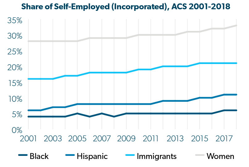 Figure 1. Shares of Self-Employed Women, Immigrants, Blacks, and Hispanics (2001-2018)3Author calculations of American Community Survey (ACS) Data