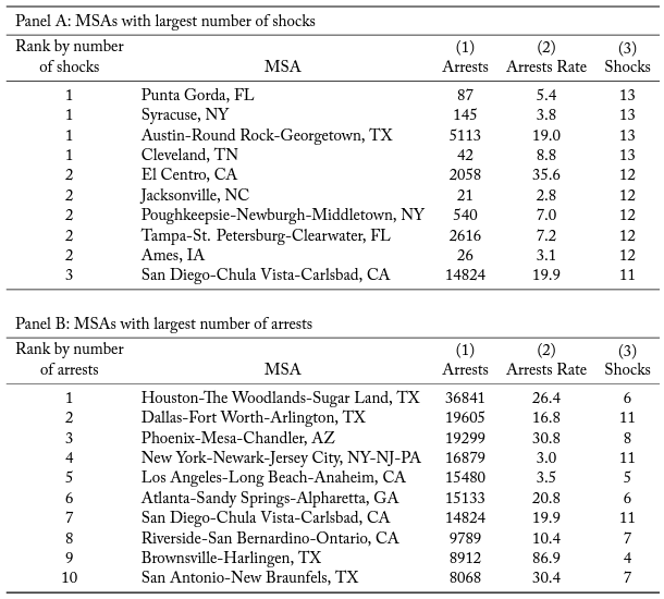 Note: This table presents immigration enforcement arrests for select MSAs over the period of observation (2014–2018). Column 1 contains the total number of arrests during the period of observation. Column 2 contains the rate of arrests expressed as the total number of arrests per 1,000 foreign-born individuals in each corresponding MSA. Note that the population of foreign-born individuals used to calculate the rate is representative of the 2014 population. Column 3 contains the total number of immigration enforcement shocks experienced in each MSA over the period of observation. Panel A reports the arrest characteristic for MSAs with the 10 most total number of arrests. Panel B reports the arrest characteristic for MSAs with the 10 most total number of immigration enforcement shocks.