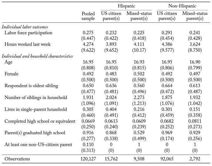 Table 2 presents the summary statistics from the CPS across Hispanic ethnicity and mixed-status families, as well as a pooled sample. The “US citizen parent(s)” category represents families where both parents, or the only parent in a single-parent family, reported US citizenship. We observe that the labor force participation rate for the pooled sample is approximately 28 percent, with Hispanics exhibiting a participation rate of 23 percent and non-Hispanics in citizen households exhibiting a somewhat higher participation rate at 30 percent. In terms of hours worked, table 2 indicates that the average US-citizen youth in our sample worked for 4.3 hours in the previous week, with Hispanics working between 3.9 and 4.1 hours and non-Hispanics between 3.6 and 4.3 hours, depending on their family’s mixed-status situation.