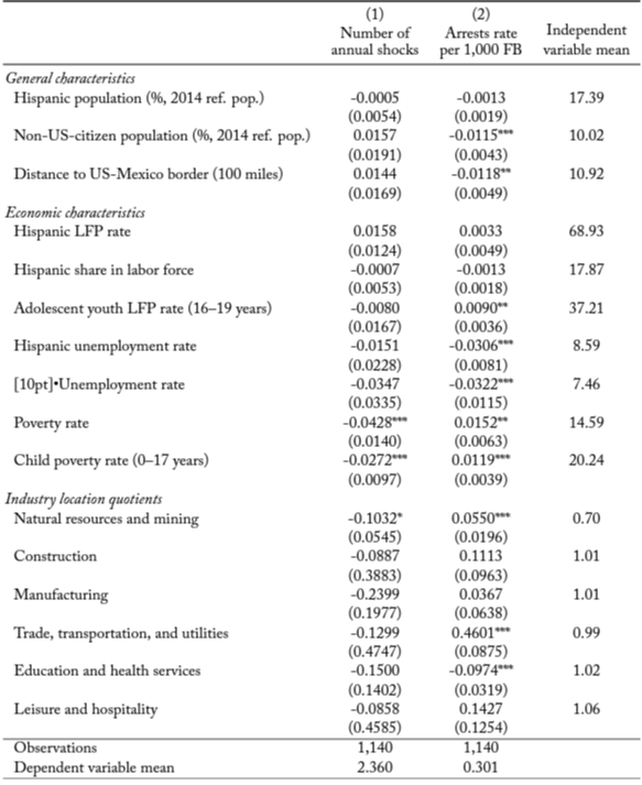 Note: The coefficients in the table were estimated by running separate regressions for different measures of MSA-specific immigration-related arrests on each MSA characteristic. All variables are aggregated at the MSA×year level. The dependent variable in column (1) is the number of immigration-related arrest shocks observed at the MSA level in a year, and in column (2), it is the rate of arrests per 1,000 foreign-born residents in 2014. Annual demographic characteristics were obtained from the 2015–2017 American Community Survey. The location quotients indicate the MSA-specific concentration of employment in a particular industry relative to the entire country and were obtained from the US Bureau of Labor Statistics. Clustered standard errors at the MSA level in parentheses. LFP=labor force participation. ∗ p < 0.1, ∗∗ p < 0.05, ∗∗∗ p < 0.01.