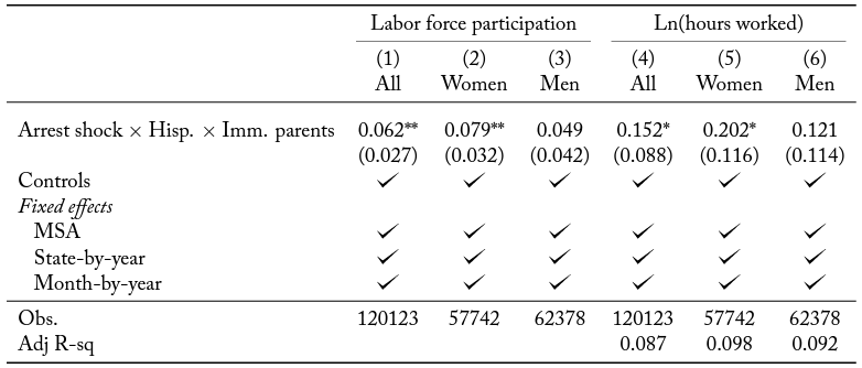 Next, we estimate the model for labor hours. As shown in table 4 column 4, we find a 15 percent increase in hours worked in the previous week in response to a shock in immigration arrests. Consistent with our previous results, we observe a larger impact among young women, for whom we estimate a 20 percent increase in hours worked. Based on the average number of hours worked per week presented in table 2, this represents a 0.8 increase in the weekly number of hours worked. Given that our model explains hours worked not conditional on employment, we interpret these estimates as a change in overall labor market activity among US-born Hispanic youth in mixed-status families.26We also estimate the effect of immigration arrest shocks on labor hours, conditional on employment. The point estimates are positive and of comparable magnitude to the ones presented in table 4.