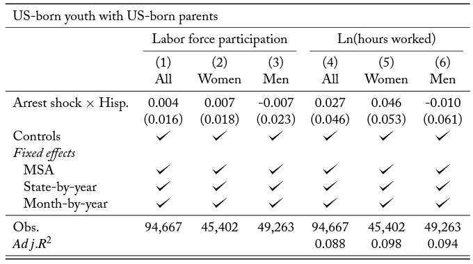 Our identification strategy requires that shocks to immigration arrests only impact the labor supply of US-born youth living in mixed-status families where at least one parent was not born in the United States. This condition implies that the sudden increase in immigration arrests should not affect citizen families. As a falsification test of these assumptions, we proceed by estimating our main specification for both labor force participation and hours worked using the sample of US-born youth with US-born parents—the sample that should not be affected by the shock.
