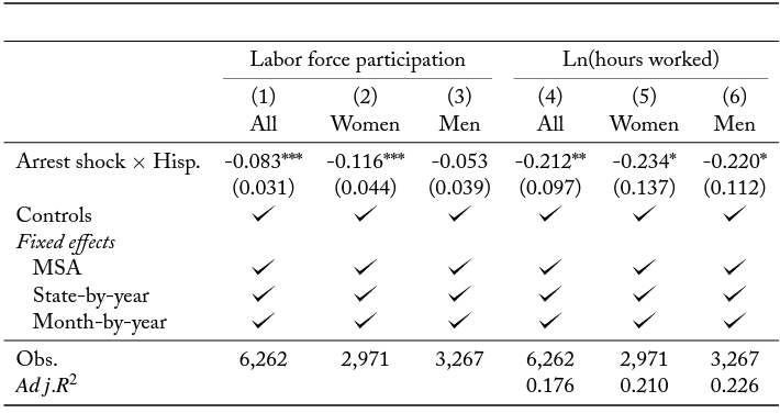 Note: This table presents regression results obtained using the sample of non-citizen youth between 16 and 18. Columns 1 through 3 show the results from the labor force participation model estimated using a linear probability model. Columns 4 through 6 show the results from the ln(hours worked) model estimated using OLS (log-linear). Note ln(hours worked) is set to 0 for those who are unemployed or out of the labor force. All regressions include controls for a contemporaneous rate of ICE arrests per 1,000 foreign born individuals at the MSA-by-period level, age, gender, race, number of siblings, an eldest sibling indicator, a single parent indicator, and parent(s)’ education. The model also includes MSA, state-by-year, and month-by-year fixed effects. The results were estimated using the CPS sample weights. Standard errors clustered at the MSA level are shown in parentheses. ∗ p < 0.1, ∗∗ p < 0.05, ∗∗∗ p < 0.01.