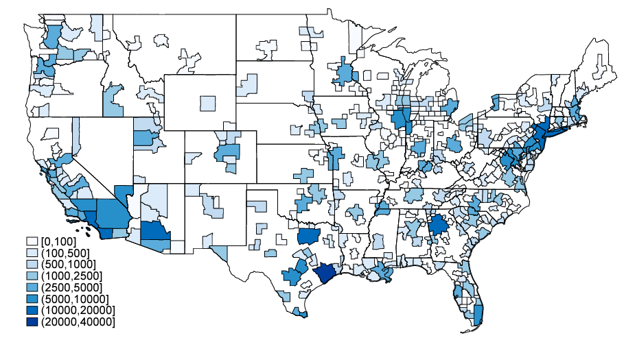 Figure 1 illustrates the geographical distribution of ICE arrests across MSAs for our entire study period. Not surprisingly, apprehensions are concentrated in MSAs that have traditionally hosted larger immigrant populations, such as those in southern California, Houston, and the Boston-Washington, DC, corridor.