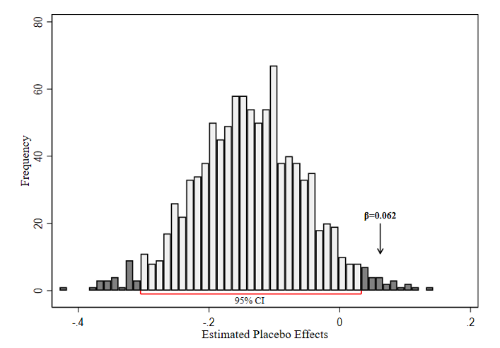 In figure 3, we plot the distribution of placebo estimates, highlighting the 95 percent confidence interval and the treatment effect estimates presented in columns 1 and 4 of table 4. The figure illustrates that the our primary results are atypical and likely not a consequence of a random chance assignment of a treatment in our identification strategy.