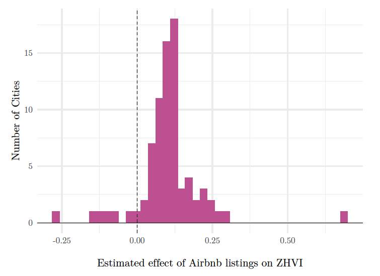 Since our data on Airbnb scrapes is more limited than the ZHVI data and the incidents call data, we restrict the estimation window for our city-level estimation of Equation (5). We merge the publicly available Tomslee and Inside Airbnb data to assemble the most comprehensive data possible. Each dataset contains a room id and scrape date variables. The room id variable is specific to an individually listed room.25The Inside Airbnb data contains a few year-months with multiple scrapes—such as November of 2019. Since we are ultimately interested in the number of listings at the zip-code year month level, we keep one room id per year month. After merging the Tomslee and Inside Airbnb data, we keep observations based on a unique room id and year-month pairing; which drops duplicate observations from both repeated scrapes within a month and observations that are shared by Tomslee and Inside Airbnb.