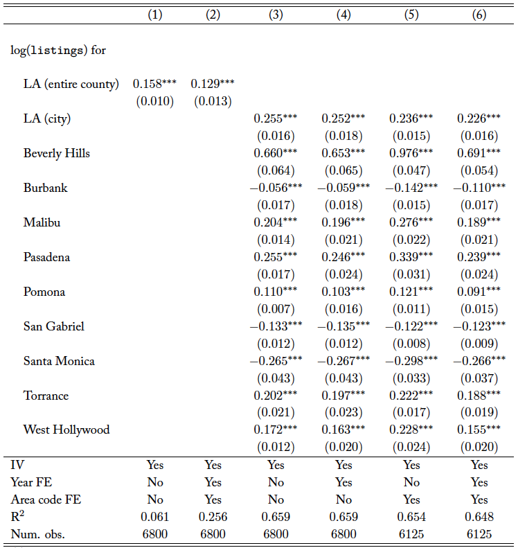Our work contributes to the recent literature examining the relationship between STR markets and housing prices. Relative to this literature, which we broadly characterize as providing average effects of STRs, our work focuses on heterogeneity in the effects of STRs. Within this literature, the closest work to our own is that of Barron et al. (2020) who introduce the instrument described above and use it to estimate the average effect of Airbnb listings on housing prices across the U.S.—their result is similar to our estimate for LA County as a whole. In contrast, we extend their model and focus our empirical work on a particular geography to demonstrate significant heterogeneity. In a recent working paper, Filippas and Horton (2020) develop a model of home-sharing through subletting, focused on tenants and landlords with negative externalities, and using New York City (NYC) as an empirical setting. Calder-Wang (2019) estimates the distributional impacts from Airbnb in NYC and finds the losses to renters (via increased prices) exceed the gains to the hosts (via an increased option value of housing). Relative to this work, we allow for the possibility that STRs generate both positive and negative externalities and explore the impact of an STR regulation directly. Valentin (2021) examines the impact of STR regulation in New Orleans and finds that regulating and restricting STRs are associated with a decline in property values. In another working paper, Fonseca (2019) analyzes the immediate impact of Santa Monica’s law on long-term rental prices using a synthetic control approach, and finds little effect. In addition to our different focus on the effects of STRs on local amenities, we use data on home-ownership prices over a longer period to identify the effects of the law.