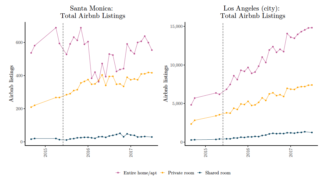 Notes: Each point on each graph represents a separate web scrape of Airbnb’s listings. The dotted line represents May 2015, when Santa Monica’s ordinance was passed. Web scrape data was obtained from insideairbnb.com and tomslee.net and harmonized.