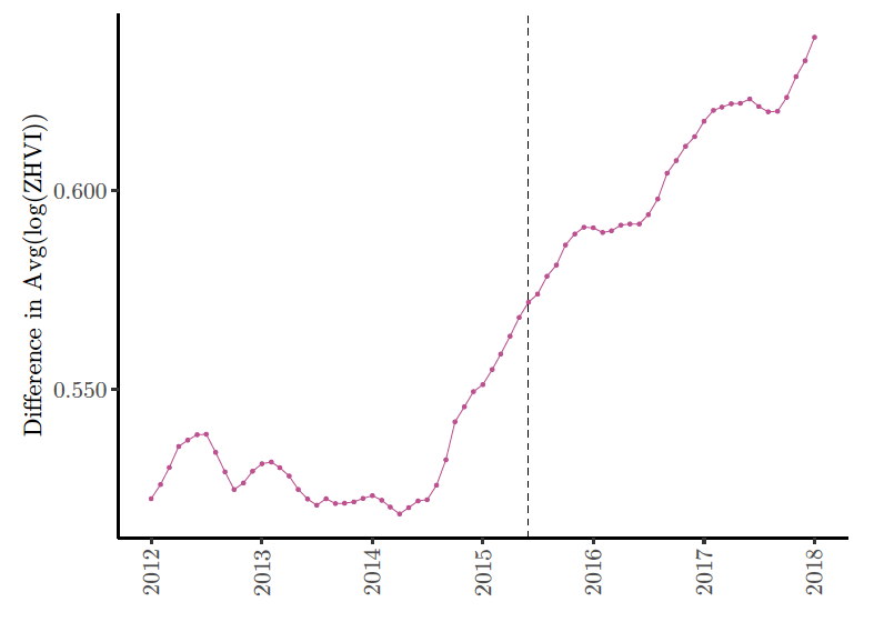 The ordinance was debated in the months before passage and was an outgrowth of a longer-term process by the City Council to update Santa Monica’s land-use and transportation plan that began in December 2013 and continued for several months beyond the adoption of the short-term rental regulation (Martin, 2015). This “spin-off ” ordinance was not unique—the City Council of Santa Monica passed other spin-off ordinances as a result of this process, including ordinances related to discrimination in long-term rental housing, water conservation policy, and commercial fitness instruction. None of these ordinances were directly related to land-use, building codes, or other regulations with first-order impacts on residential housing prices or neighborhood amenities. Furthermore, none of the ordinances passed during this period were directly related to establishments offering on-premise alcohol consumption or public intoxication, which we investigate in Section 6.1. The major components of the ongoing planning effort primarily concerned requirements for commercial buildings and multi-family dwellings, and thus it is unlikely that this process alone would have created significant changes in housing prices until its provisions went into effect and future construction projects were designed in compliance with those provisions. If anything, the land-use plan encouraged the construction of additional multi-family dwellings by rezoning certain areas in the city and easing restrictions on accessory dwelling units, which would decrease housing prices compared to a counterfactual with no change in land-use policy, even if such changes were anticipated.8The conclusions in this paragraph are drawn from our review of the text of the ordinance and contemporaneous measures as well as meeting minutes and archived video of Santa Monica City Council meetings. We are unable to find any evidence to contradict these assertions.
