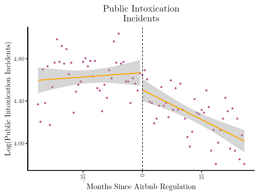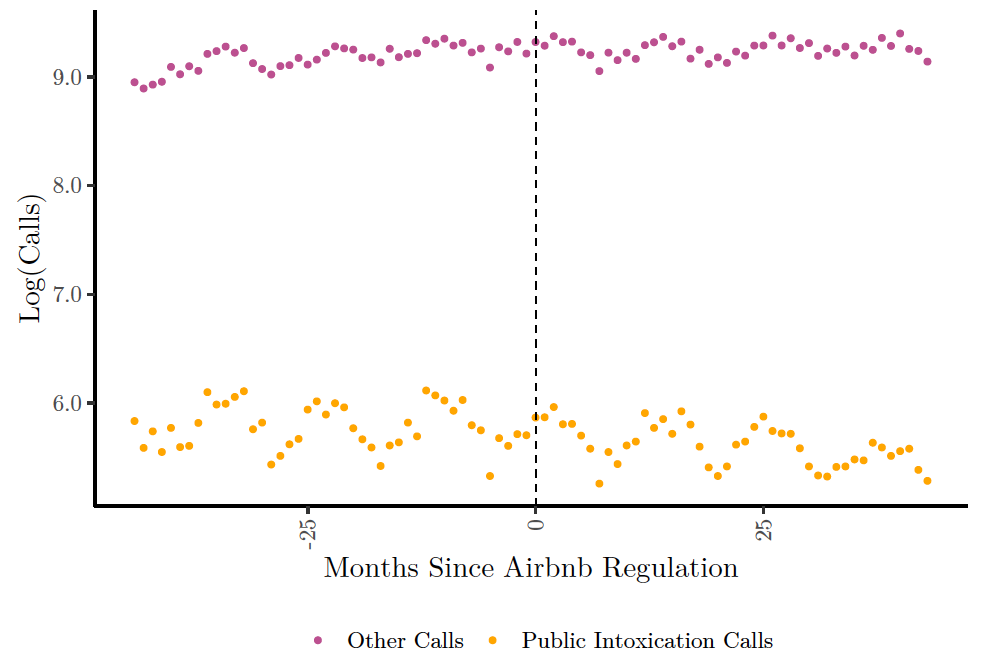 These results suggest that regulations restricting STRs may lead to increased housing prices. In Section 6, we examine the effects of an STR restriction enacted by the wealthy oceanfront suburb of Santa Monica—a jurisdiction for which we estimate a negative relationship between STRs and housing prices. The 2015 law, enacted in part due to concerns about increasing housing prices in the city, was arguably the strictest regulation on STR activity in effect in the United States at the time (Sanders, 2015). It is important to note, upfront, that we are not claiming this policy change is exogenous to housing prices—per the contemporaneous press, it was implemented in response to a simultaneous increase in STR listings and housing prices (Logan, 2015). We first document that the law was (at least temporarily) successful in reducing the number of Airbnb listings that would be most likely to generate negative externalities. Using a difference-in-differences framework with the rest of LA County as a control, we show that these regulations almost certainly did not decrease housing prices and may have increased housing prices by about 8%. Finally, we provide suggestive evidence for our externality mechanism by examining detailed call data from the Santa Monica Police Department. Using a difference-in-differences framework with linear trends to account for delays in enforcement, we show that public intoxication calls decreased relative to other types of calls.5In a conference paper, Han and Wang (2019) study the relationship between STRs and the crime rate in New York City and San Francisco using policy changes that primarily affected commercial listings and find qualitatively similar results.