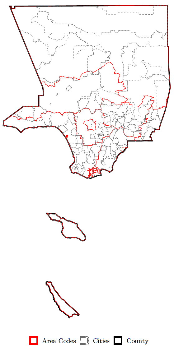 In this section, we provide two maps to assist readers who may not be familiar with LA County. Figure A.1 illustrates the 88 incorporated cities in Los Angeles County. We highlight those which are displayed in Tables 1 and 4. Figure A.2 provides an overview of the area codes used as fixed effects and their intersection with cities in Los Angeles County.