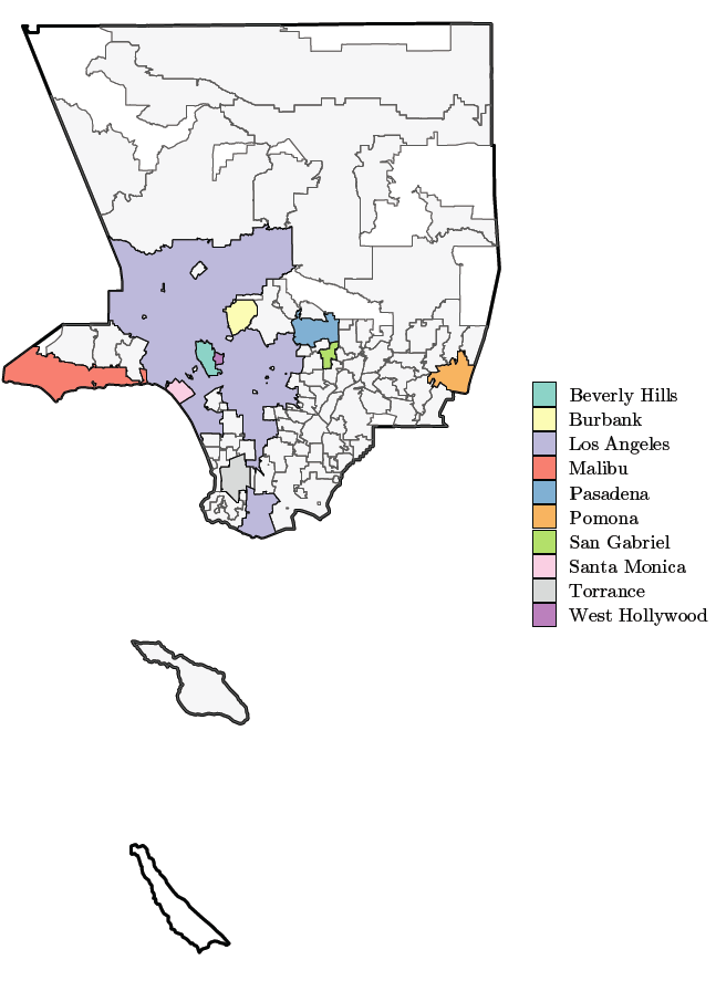 This figure depicts incorporated city boundaries in LA County. The highlighted cities are those displayed in Table 4. White areas within the county borders are unincorporated.