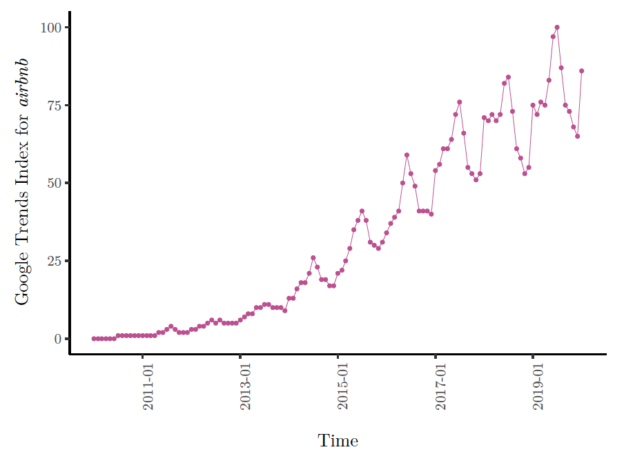 We obtain Airbnb listing data from insideairbnb.com and tomslee.net, where each of these sources provides snapshots of consumer-facing listings available on specific days, collected by web-scraping. For each listing, we observe a unique host and room identifier, the jurisdiction for the short-term rental unit, the daily price, and the (mutually exclusive) room type: “Entire unit,” “private room,” and “shared room.” We aggregate these listings to the zip-code level and construct measures of STR supply based on the total number of listings of each type. These data were scraped at irregular intervals (see Appendix Section A.3 for more details). We obtain all scrape dates from 2014 (the earliest available) to 2019. These data have previously been used to understand the relationship between Airbnb listings and housing prices in other geographies (Garcia-López et al., 2020). Finally, to construct the instrumental variable described in Section 5, we obtain Google Trends data for “Airbnb,” and also collect the number of food and accommodation establishments (NAICS 72) in each zip code in 2010 from the ZIP Code Business Patterns data released by the U.S. Census.