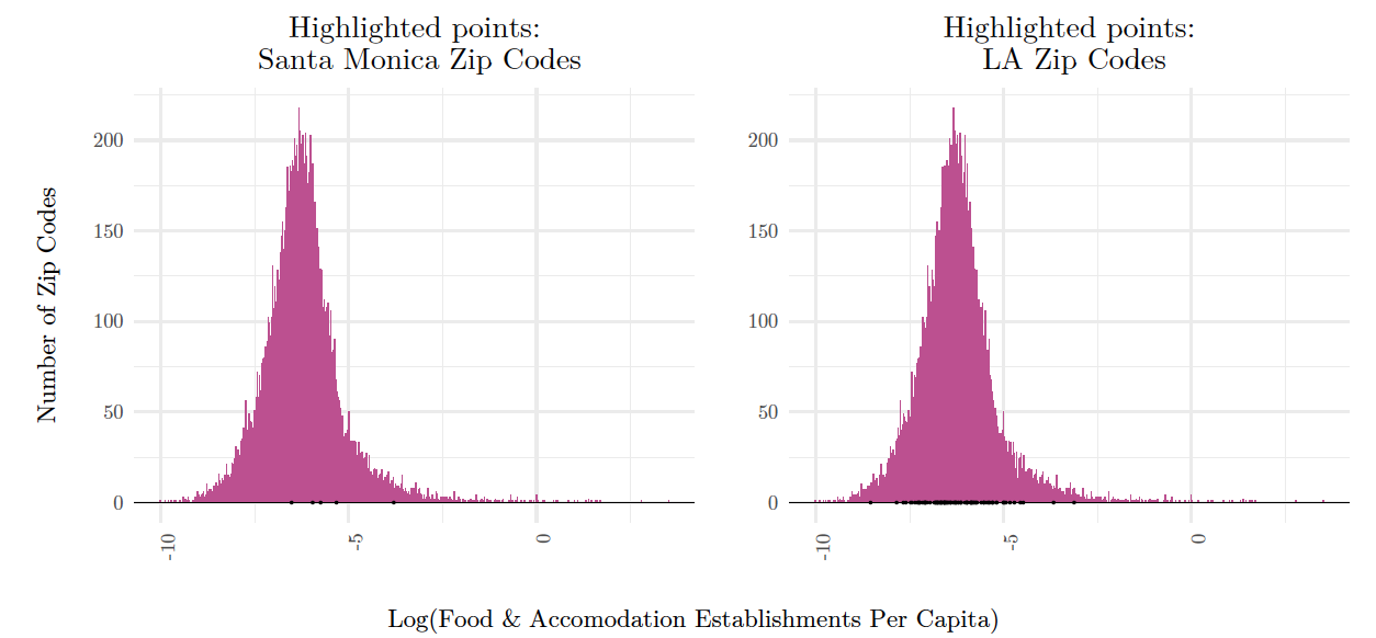 Notes: These figures illustrate the distribution of zip codes in the U.S. according to the log of the per-capita number of food and accomodation establishments in 2010 (as defined by NAICS 72). Dots on the horizontal axis indicate zip codes for the cities in question.