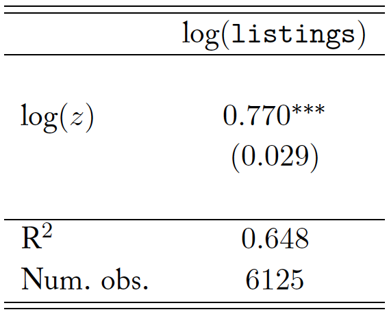 Equations (3) and (4) can be used to frame the expected impacts of STR regulations. Some STR regulations (e.g., occupancy taxes or other hospitality business taxes) may be viewed as a change to the present value of being an absentee landlord. Other regulations however may be direct shocks to the number of Airbnb listings allowed—e.g, limits on individual choices to be absentee landlords—resulting in a direct change in .