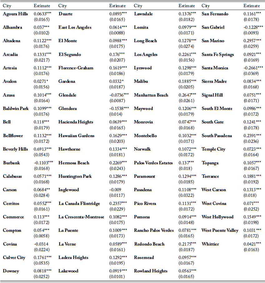 Table 2 reports summary statistics for these data as used in our analyses. We discuss the details of our sample construction procedure in Appendix Section A.3. The first set of rows reports the ZHVI for LA County as a whole and for the set of its constituent cities displayed in Table 1. The last column computes the average annual percentage change in each ZHVI between 2014 and 2019. Each city experienced increases in housing prices throughout our data. However, these increases range from 5% in Torrance to 15% in Beverly Hills.