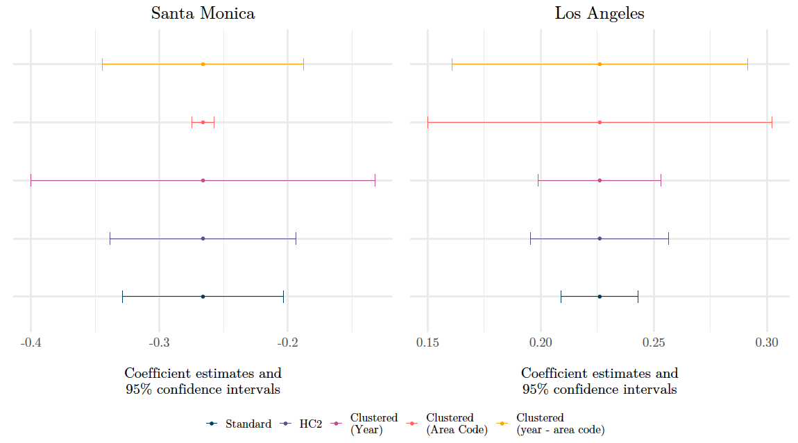 In this section, we present our primary IV estimates with alternative standard error clustering. Our estimates are remarkably robust to different standard error types. As a visual tool, we provide a coefficient plot for Santa Monica and LA, in which we vary the standard error type. We use our most saturated specification (with year and area code fixed effects) for each specification presented.