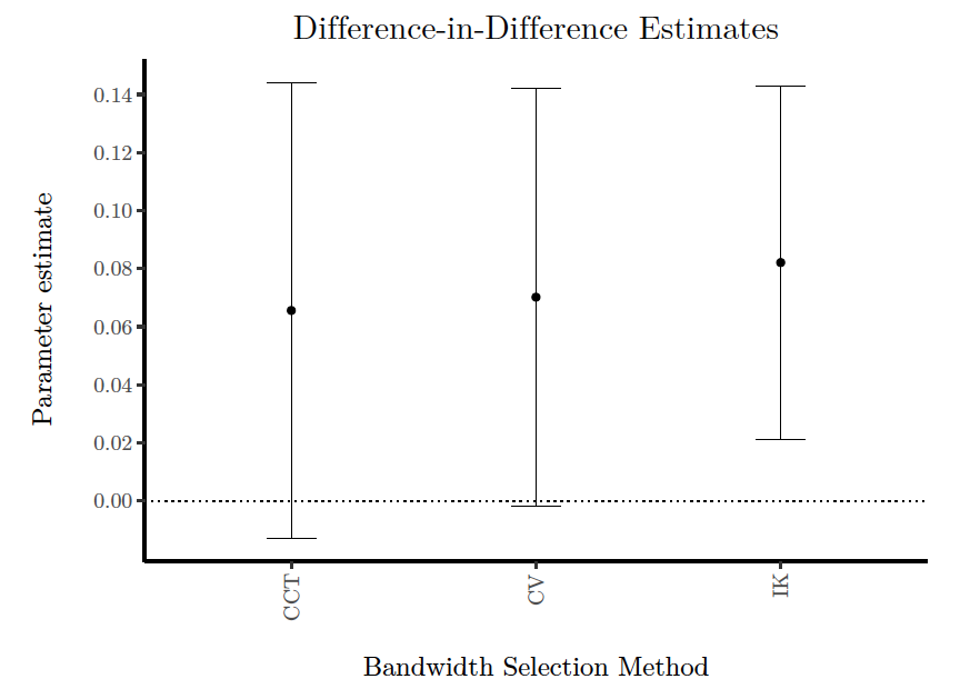 Imbens, G. and K. Kalyanaraman (2011, 11). Optimal Bandwidth Choice for the Regression Discontinuity Estimator. Review of Economic Studies 79(3), 933–959.