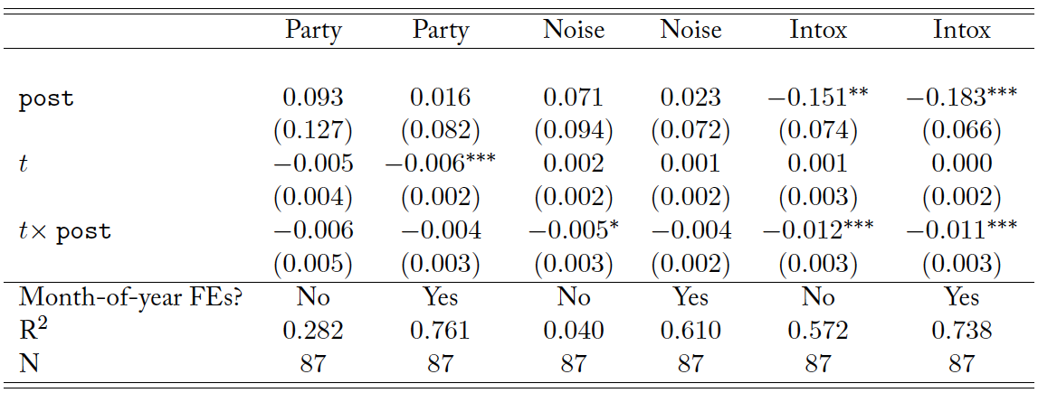 Notes: This table reports estimates of Equation (8). The bandwidth is chosen per the optimal bandwidth technique of Imbens and Kalyanaraman (2011). An observation is a month-year. The dependent variable is the log of the number of police calls reported in Santa Monica for one of three call types: party complaints, noise complaints, or public intoxication complaints. Heteroskedastic robust standard errors are in parentheses. Stars indicate p-values: *** p < 0.01; ** p < 0.05; * p < 0.1.
