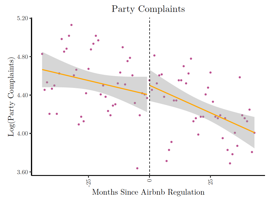 However, while the presence of hotels in a neighborhood creates positive demand spillovers for other service industries, hotels and other tourism-related firms are also associated with local negative externalities such as public intoxication, petty theft, and other “nuisances” (Brunt and Hambly, 1999; Ho et al., 2009). Insofar as STRs offer services that can substitute for the services of traditional hospitality firms—as has been proposed by Zervas et al. (2017) and Farronato and Fradkin (2018)—STRs may generate similar negative externalities. Airbnb, in particular, has received negative media attention for its “party house” listings (Lieber, 2015; Coles et al., 2017).4By offering “owner-absent” rentals of detached homes, STRs may host activities with negative externalities that would likely be deterred by the presence of hotel staff. Furthermore, as STRs are generally located in quieter, traditionally owner-occupied residential areas, the same activities may generate greater social costs when they take place in an STR as opposed to a hotel. Indeed, Fontana (2021) finds that increases in Airbnb penetration in London leads to increases in complaints against tourists and a decrease in neighborhood quality. If the cost of such externalities outweighs the benefits from increased demand for local businesses—in other words, if STRs sufficiently “threaten the stability and character” of neighborhoods (Martin, 2018)—the net effect of STRs on the overall level of local amenities, and potentially on housing prices, may be negative. In this paper, we demonstrate this both theoretically and empirically.
