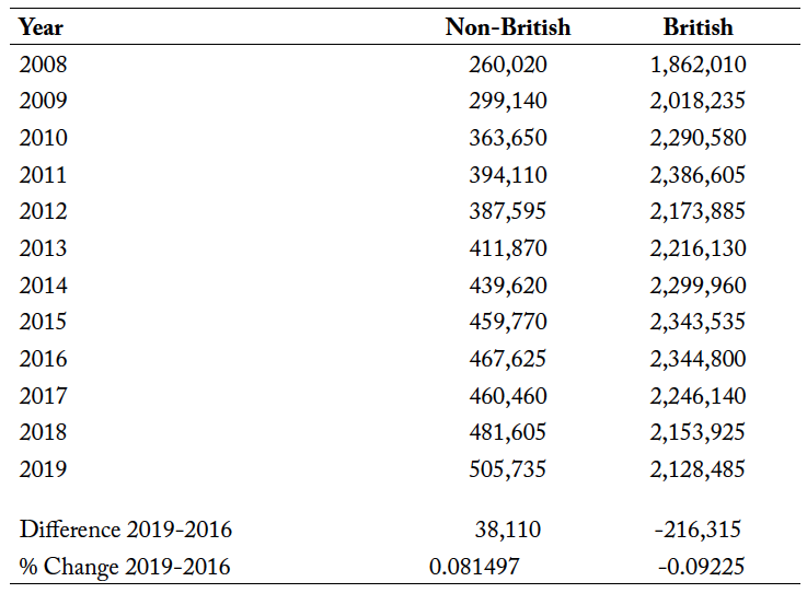 Notes: The table shows total applications by year and British vs non-British.
