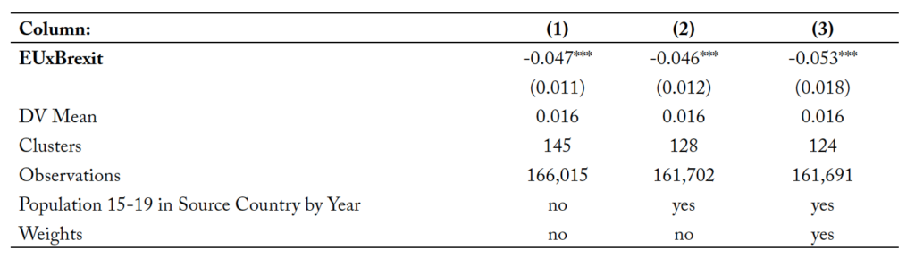 Notes: The dependent variable is the growth rate in applications across two consecutive years. The growth rate is computed by taking the first difference of the inverse hyperbolic sine transformation of applications by cell. Brexit refers to an indicator set equal to one for all years after 2016. Additional regressors include an EU dummy, subject, university, and year fixed effects, as well as the population 15-19 years old in the source country by year. All regressions are weighted by the number of applications from a particular country to UK universities in the initial year. Significance levels are given by: * p<0.10, ** p<0.05, *** p<0.01.