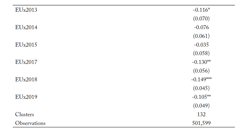 At the bottom of Table 1, we compute the difference in the growth rate of applications between 2016 and 2019 (the last year for which we have data) for students from an EU country and for students from a non-EU country. As shown therein, the rate of growth of student applications from non-EU countries grew by 3.6 percentage points over that period, whereas it declined by 6.3 percentage points for students from EU nations. As a result, vis-à-vis international student applications from non-EU countries, the growth rate of student applications from EU countries declined by 10 percentage points over the 2016 through 2019 period.
