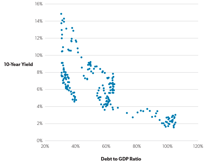 Figure 1. A scatter plot of the yield on 10-year Treasury bonds versus the debt-to-GDP ratio at quarterly intervals from 1966 to the second quarter of 2019.