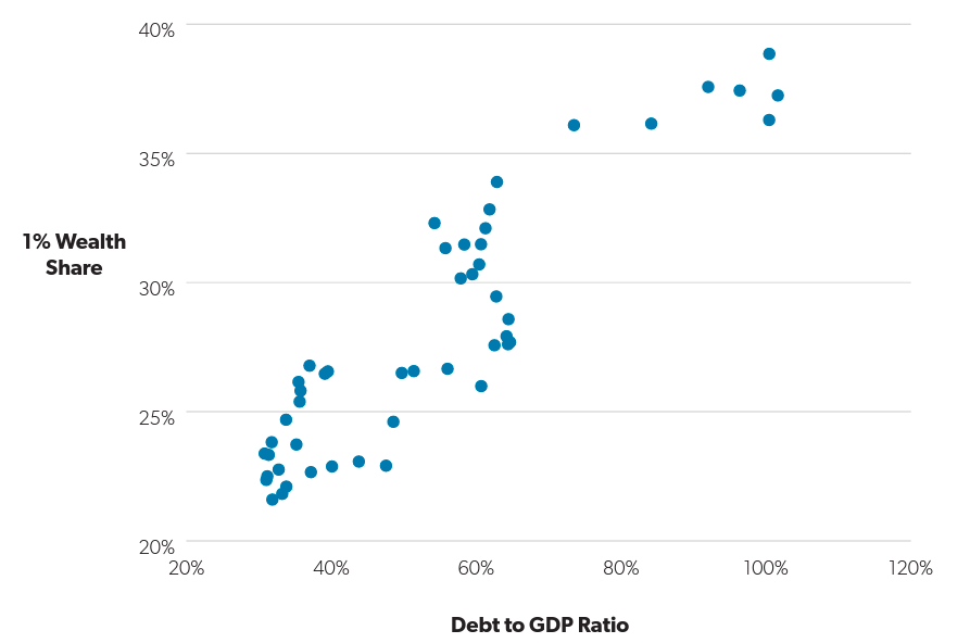 While it is fairly well known that the debt has not put upward pressure on interest rates, another correlation involving the public debt has virtually escaped attention, even among academic economists. Figure 3 is a scatter plot of the debt-to-income ratio versus the fraction of wealth owned by the top 1 percent as estimated by Saez and Zucman.7Emmanuel Saez and Gabriel Zucman, “Wealth Inequality in the United States since 1913: Evidence from Capitalized Income Tax Data,” Quarterly Journal of Economics 131, no. 2 (2016): 519–78. At the same time that the US government has extravagantly increased its borrowing, we have seen the rise in inequality documented by Piketty, resulting in a positive correlation between these variables.8Piketty, Capital. Our main thesis is that this correlation is not a historical coincidence.