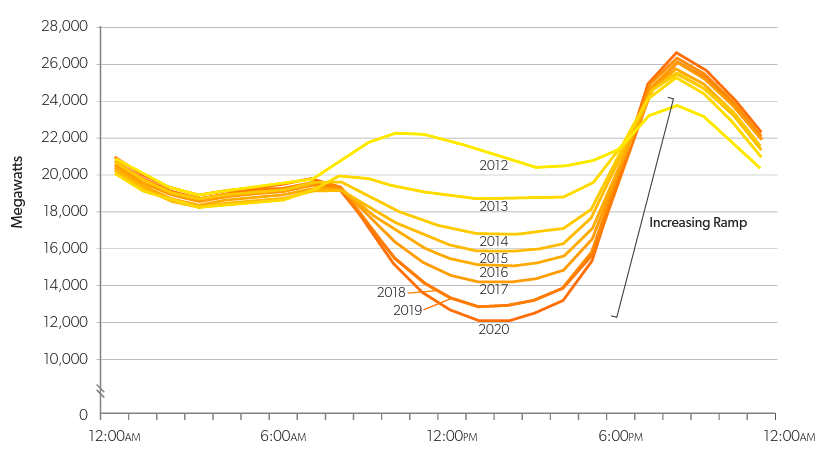 Figure 5: The “Duck Curve”: Ramping Requirements Grow as More Solar is Added to the Grid52This graphic uses the original projections from 2014 onward. California Independent System Operator. (2016). What the duck curve tells us about managing a green grid. CASIO. https://www.caiso.com/documents/flexibleresourceshelprenewables_fastfacts.pdf.