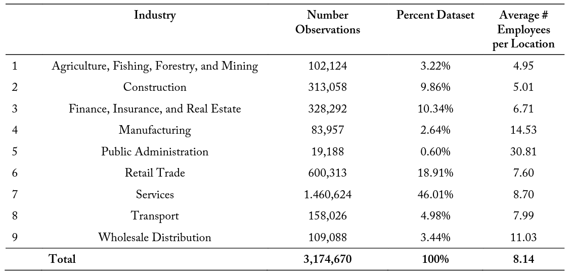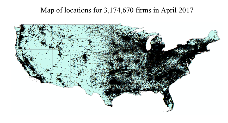 I obtained data on firm characteristics and locations through large-scale web scraping from a popular sales lead company, Reference USA, during April 2017. These data are collected at the firm level, as opposed to earlier studies that used establishment data aggregated to the zip code or county level. Collected variables include the exact longitude and latitude of the firm location, SIC and NAICS codes at the sixdigit level, employee and sales estimations, credit ratings, etc. Figure 1 contains a map of the exact locations for the 3,174,670 firms in my sample. The firms contained in this data set were established between 1994 and 2016 and are located within the continental United States. This study is limited to companies that were established in or after 1994 because the focus of the study is on companies from the internet age. The internet drastically changed the ability of companies to conduct sales and services at a distance, which affects business entry and location decisions.