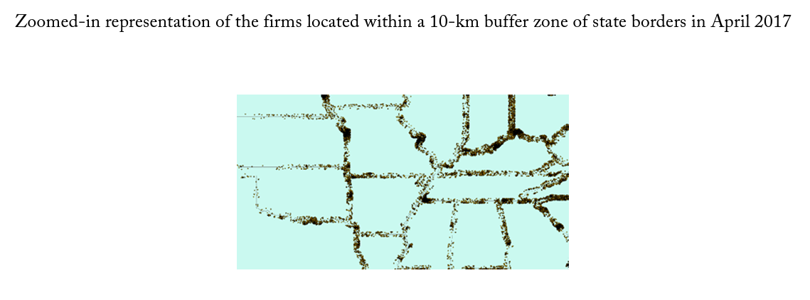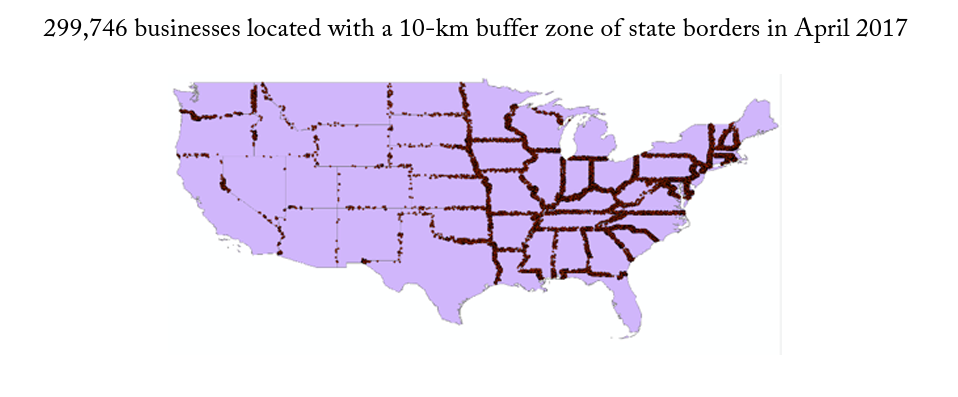 There are 109 different state border pairs, including a few that consist of a single point, such as GeorgiaNorth Carolina. For the empirical results, I conduct this analysis on buffer zone sizes of 1, 5, and 10 kilometers. First, I use geographic information systems (GIS) to overlay my cross-sectional firm location data from April 2017 onto detailed state maps. I use the longitude and latitude for the location of each firm to determine both the firm’s exact location on a map and its distance from other geographic features. I identify the shortest possible distance from each firm to its closest state border containing two or more states. I then use GIS to draw buffer zones around state borders and identify each firm that falls within particular ranges of distance. For graphical illustration, figure 2 shows a map of the 299,746 businesses launched within a 10-kilometer buffer of a state border pair. Figure 3 provides a zoomed-in look at a selection of states.