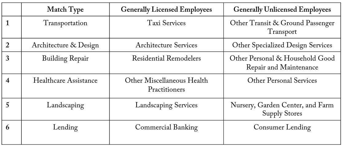 Match Type (3) contains overlapping industries that conduct building repair. Residential Remodelers (NAICS 236118) is comprised of establishments responsible for remodeling construction projects for residential single-family and multifamily buildings. Projects that are valued at over $1000 of home repair generally require modifications to be conducted by employees who hold occupational licenses in various fields—these include electrical, cement, drywall, cabinetry, HVAC, etc. Since residential remodeling typically works with high-value projects, most employees hold occupational licenses in a related field. In a related classification, Other Personal and Household Goods Repair and Maintenance (NAICS 811490) also contains firms that repair and maintain residential buildings, but these are often associated with lower value projects. Since these projects tend to have lower monetary cost, they may not require a workforce with state-required occupational licenses. Therefore, for the purpose of this study, these firms are defined as having generally unlicensed employees.
