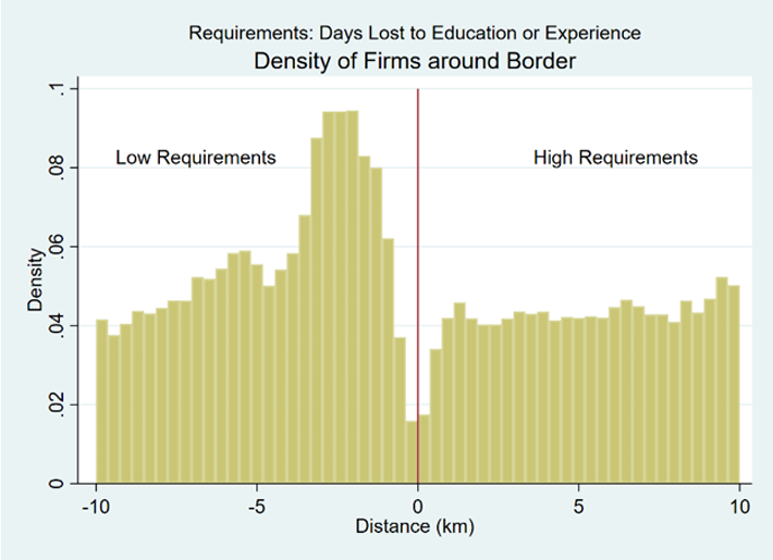 Figure 4 depicts a histogram showing the density of firms within 10 kilometers of all shared state borders, with the low-cost state on the left and high-cost state on the right. The cost represented is the number of calendar days required to complete education and experience training. These days required are often translated as a cost to firms in terms of higher wages, payments for classes, and lost revenue. There appears to be a substantial increase in the density of firms within a few kilometers inside the border of the low-cost state.