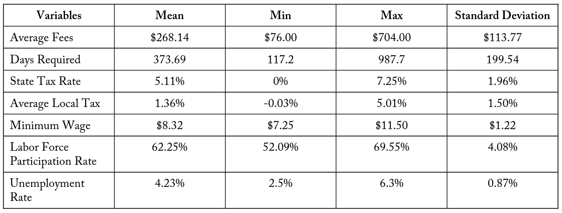 Twenty-five percent of participants in the United States workforce require an occupational license, which is greater than the percentage of workers directly impacted by unions or the minimum wage (U.S. Bureau of Labor Statistics 2016). Occupational licensing is the mechanism of imposing minimum requirements to work within a specific job classification, and these requirements generally differ at the state-level. An individual attempting to obtain an occupational license will incur costs in the form of fees, examinations, and days required to complete education and experience mandates. Obtaining an occupational license for employees, or paying a wage premium for licensed workers, constitutes a significant cost consideration for firms. These costs may influence whether a business enters into a market or hires employees. Understanding the relationship between occupational licensing costs and firm decisions have important policy implications for how a state encourages business development and employment.