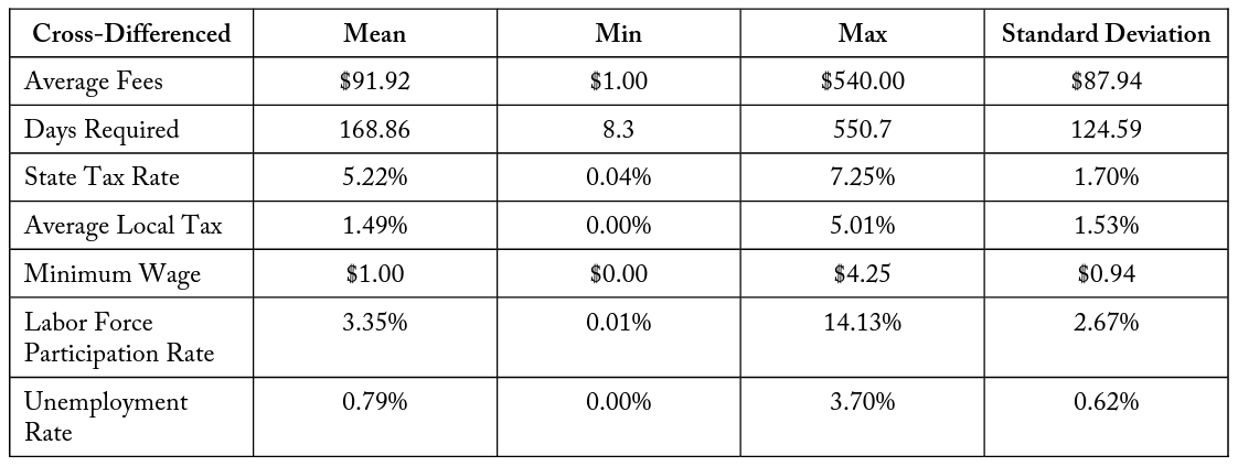 Tables 3 and 4 contain summary statistics for the state-level variables and cross-differenced state-level variables, respectively. To measure the regulatory environment of a state, simple averages are taken across occupations of the monetary fees and number of calendar days required to complete mandatory education and training for obtaining a license. These variables allow for the comparison of differences in regulatory environments between states. For the United States, Nevada is the most expensive state in terms of monetary fees, with $704 being the average cost of an occupational license. The least expensive is Nebraska, where the average cost for a license is $76. Across the states the mean is $268.14, with a standard deviation of $113.77. In regard to calendar days required to complete mandatory education and training, Pennsylvania has the shortest number of average days required at 117.2 days. Hawaii, in comparison, has the highest average estimated days required to complete mandatory education and training, at 988 days. For the United States, the mean is 373.7 days, with a standard deviation of 199.5 days. Both variables are approximately standard normal in their distribution.