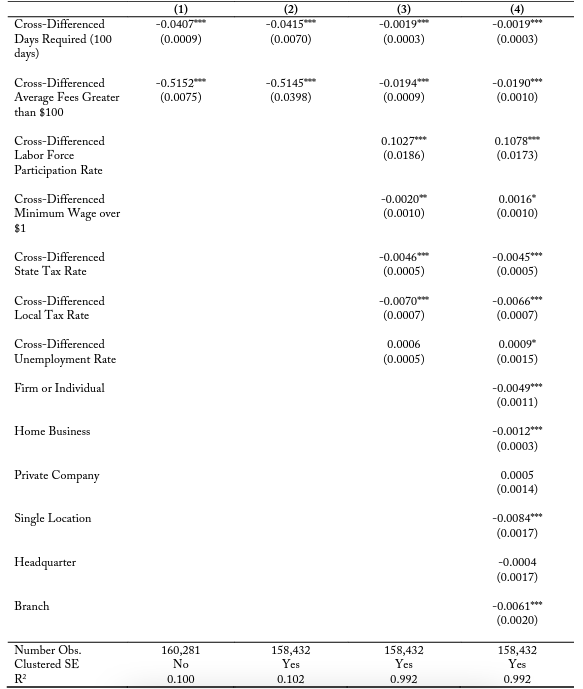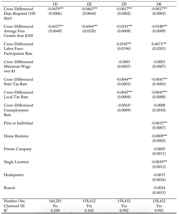 Since the firms are observed over a geographic longitude and latitude space, column (2) clusters the standard errors in bins of distance from the state border and finds almost identical trends in terms of magnitude and direction for the marginal effect of the the cross-differenced days required and average fees. Column (3) includes a variety of cross-border differenced control variables. Column (4) includes a variety of firm-specific variables regarding business structure. The direction and the significance of the marginal effect of the cross-difference days required on firm entry probability are consistent, though the magnitude of the coefficient estimate is smaller at -0.0013. When controlling for additional cross-border attributes, the magnitude of the coefficient estimate for cross-difference average fees becomes much smaller, ranging from -0.0154 to -0.0149. This shows that a border side having average monetary fees greater than their adjacent state by over $100 is associated with a 1.49 percent decrease in the likelihood a firm will enter the market there.