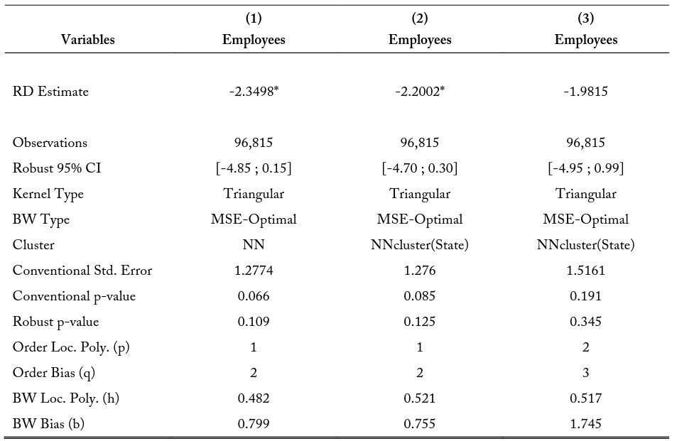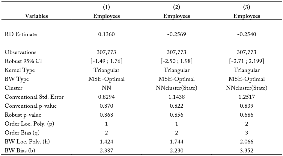 Notes: The RD Estimates represent the difference in the point estimate at the border when approaching the state border from either state interior. For example, the estimate for model (3) shows when considering all the first within a 2.5-kilometer buffer of the state border, the model predicts firms from the state with the higher education and experience requirements will have 1.9815 fewer employees on average.