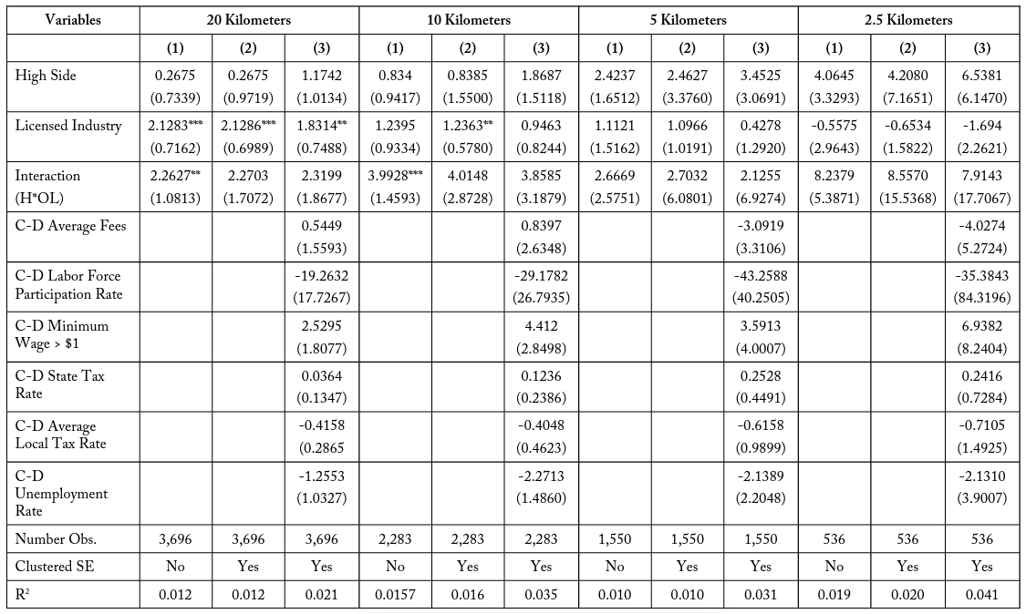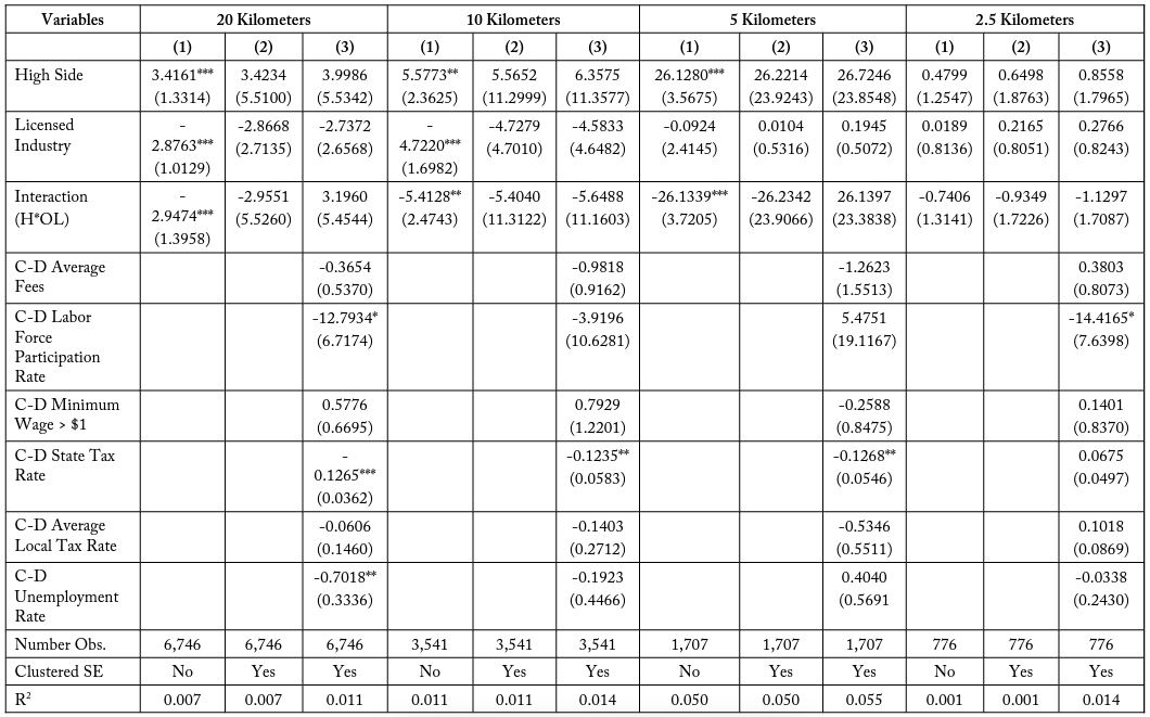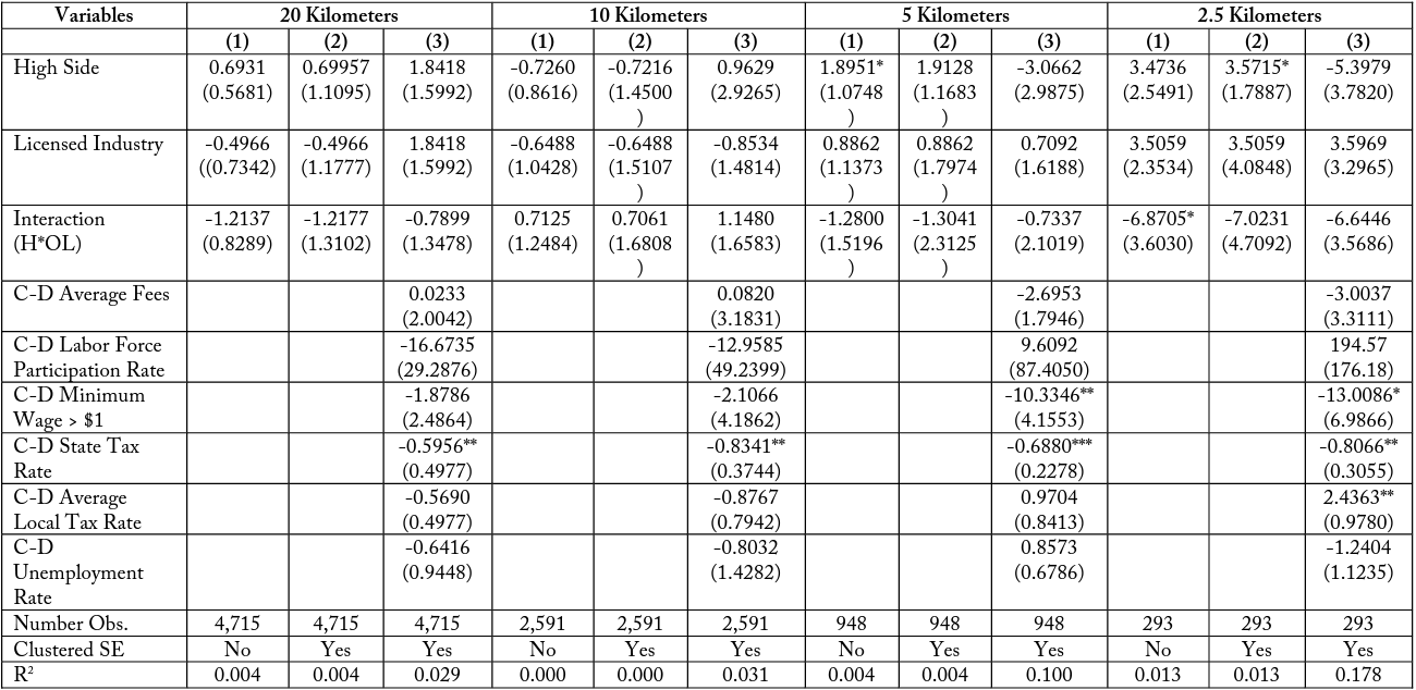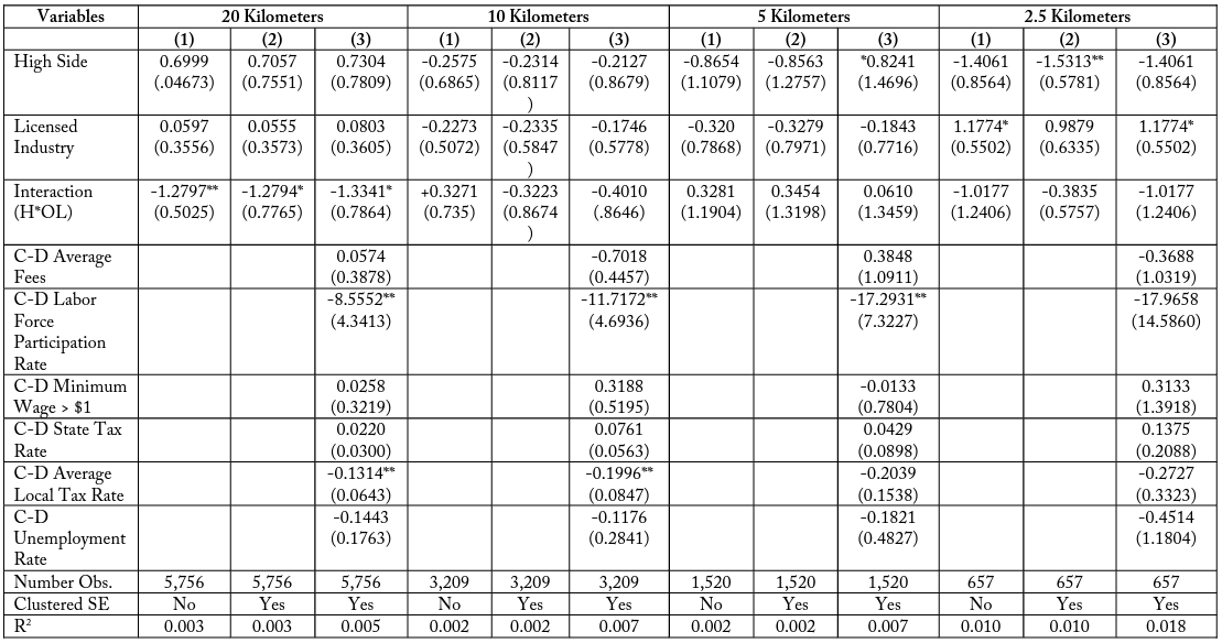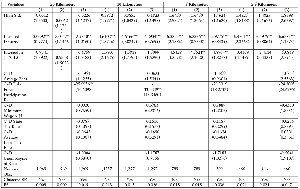 I find that for the total firm model in table 15, the interaction term (H*OL) is consistently negative for all specifications and buffer zone distances. This coefficient represents a negative effect on firm employment for licensed firms in high-costs states that is not accounted for by differences in the border sides or differences between industries. Though the interaction term is not always significant, this may be due to an imprecise selection of controls. It is important to observe that the magnitude of this interaction effect in the total firms case is larger when considering firms in smaller buffer zones, in all specifications. For example, the most restrictive model presented in column (3) has a negative interaction coefficient of – 1.8648 when considering all firms within 20 kilometers of a state border. This means that licensed firms in high-cost states typically have 1.9 fewer employees, even when accounting for industry and border differences. When considering only firms within 10 kilometers of the state border, this interaction term increases in magnitude to -1.5785 and increases further to -3.9741 and -3.8537 for firms located within 5 and 2.5 kilometers of a state border, respectively.