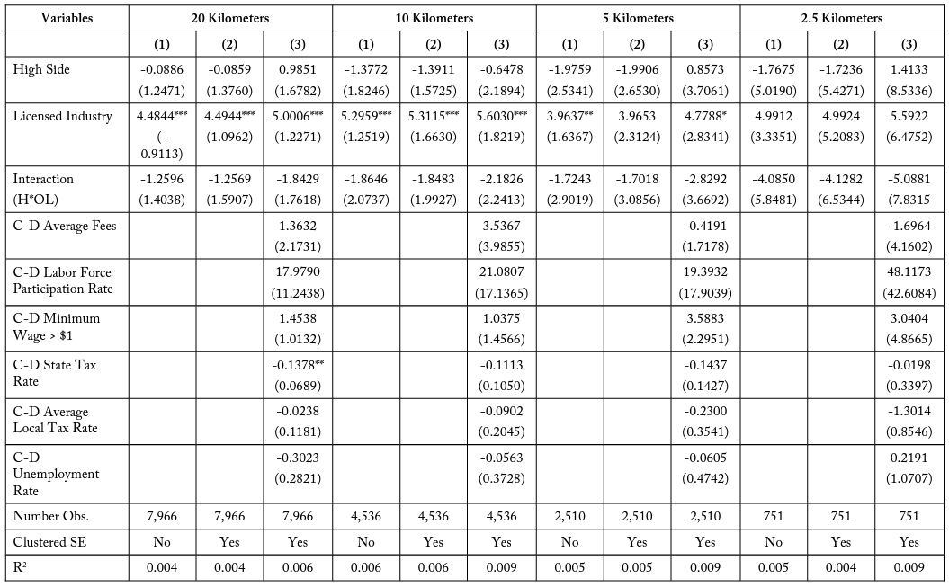 Previous studies focus on the effects of occupational licensing regulations on employees in the form of wage premiums and on consumers in the form of price and quality changes for goods and services. To my knowledge, my model is one of the first spatial models developed for understanding the relationship between firm density and occupational licensing costs near state borders. My empirical methodology provides an analytical explanation of firm entry decisions and the causal effects of occupational licensing costs on firm employment near state borders. In doing so, I explain how these regulations affect decisions and preferences of firms, which can have widespread effects on public policy and welfare.