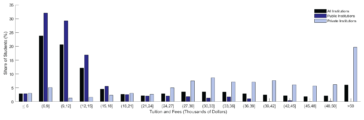 Statistics for the average costs and benefits of college gloss over the wide range of experiences of students with different family backgrounds, academic preparation, and choices of institution and major. While $20,000 is the average sticker price tuition across all US four-year colleges, tuition varies tremendously by institution. For example, figure 1 shows that, as of 2018, most students at public colleges attend institutions with published tuition and fees that amount to less than $15,000, whereas a large fraction of students at private colleges are charged more than $50,000.