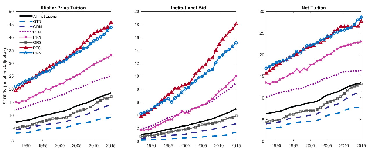 Digging deeper into college pricing, figure 2 shows the behavior of multiple measures of tuition based on whether a college is public or private (G vs. P), teaching-focused or research-focused (T vs. R), and nonselective or selective (N vs. S).7Research-focused universities are designated as such based on their Carnegie classification. Schools are classified as selective if the average SAT (or ACT converted into SAT) score exceeds 1250. Sticker price tuition often garners the most public attention, but it is an inaccurate measure of the financial burden on students, their families, or even taxpayers. Unlike in most other sectors of the economy, where the businesses setting prices have little direct knowledge about the financial well-being of specific customers, thanks to the financial aid application process colleges receive detailed information about the income and assets of each student’s family. This allows colleges to charge different prices to different families based on each family’s estimated ability to pay. Naturally, colleges do not advertise the fact that they set prices this way. Instead, functionally, each college sets a uniform tuition price and then offers institutional need-based and merit-based discounts that lower the effective price for specific individuals. For all intents and purposes, however, this practice is just price discrimination—greatly facilitated by the financial information provided on the standard government FAFSA (Free Application for Federal Student Aid) form. To provide a sense of scale, the middle panel of figure 2 shows that the average amount of institutional discounting is approximately $5,000 per year, though it ranges from less than $2,000 for nonselective, teaching-focused public colleges to nearly $20,000 for selective, teaching-focused private colleges. Thus, on balance, even though sticker price tuition has risen by nearly $25,000 since the late 1980s for selective private schools, the net tuition these schools charge to students has risen by just over $10,000. Although tuition has increased by the most in absolute dollar amounts at private colleges, in-state and out-of-state tuition at flagship public universities has increased substantially in relative terms. However, just as before, in-state and out-of-state sticker price tuition are misleading indicators of the net prices students pay.